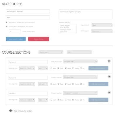 Setting up and detailing information about classes goes a long way towards establishing the day to day school schedule. Teachers can take attendance for each of their classes and help manage their students. With tools to associate specific course sections to a class, staff and administrators can get a grasp of when students and teachers meet up to learn a subject. Creating and gathering data about course grade weight, location, time, days, and students enrolled, gives users a lot of knowledge about how the school is running.