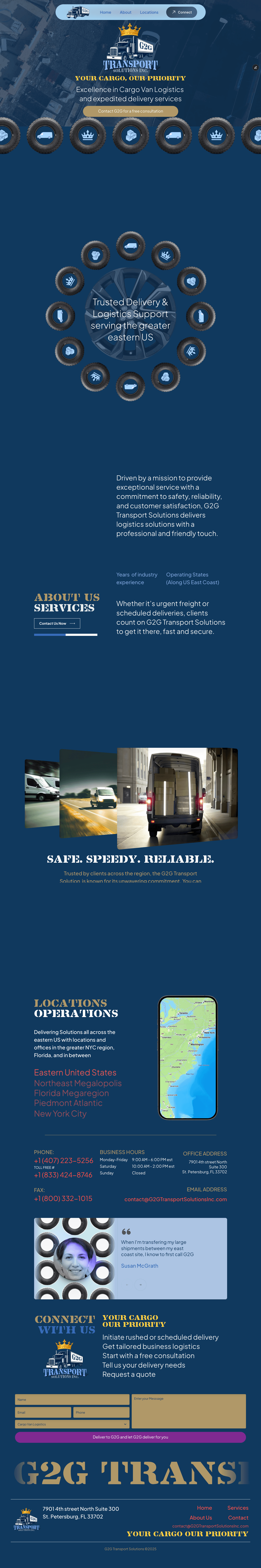 Trusted by clients across the greater eastern US G2G Transport Solution is known for its unwavering commitment. Ship your goods quickly and securely. G2G recieved help developing business strategy, defining target market, logo and branding, copywriting, website design, development and administration.